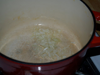 Make rice either in the rice cooker or on the stove top. While the rice is cooking, in a heavy-bottomed sauce pan, put in the oil and add in the onions, softening them up.